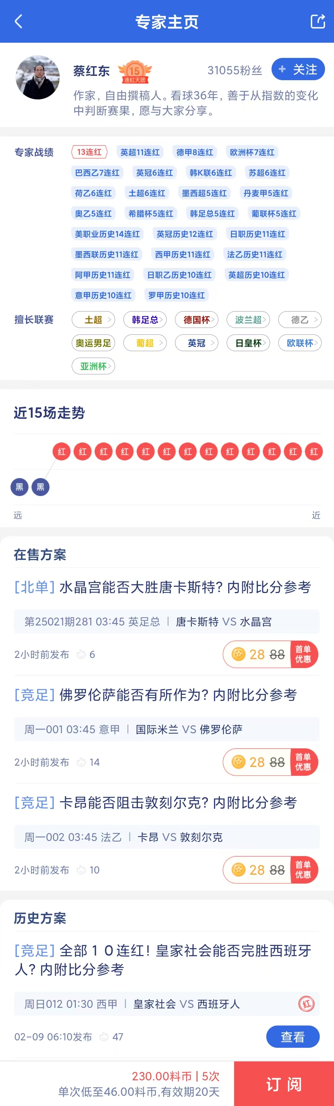 竞彩专家“蔡红东”状态爆棚,近期豪取13连红!今日最新推荐已更新,订阅更优惠!不要错过!