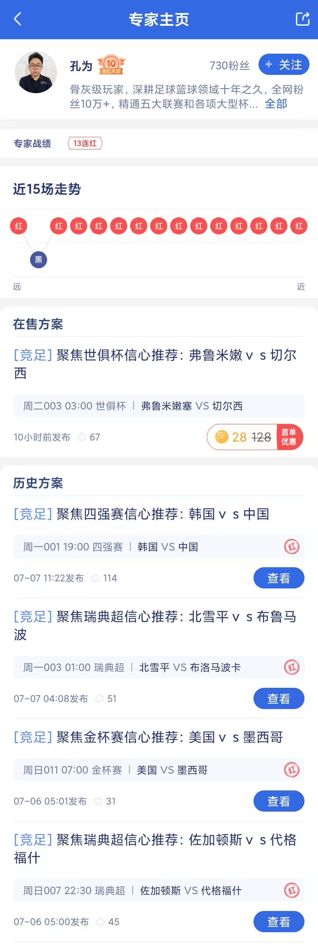 竞彩专家“孔为”近期状态极佳,豪取13连红!今日带来世俱杯半决赛推荐,向着15连红天团前进!