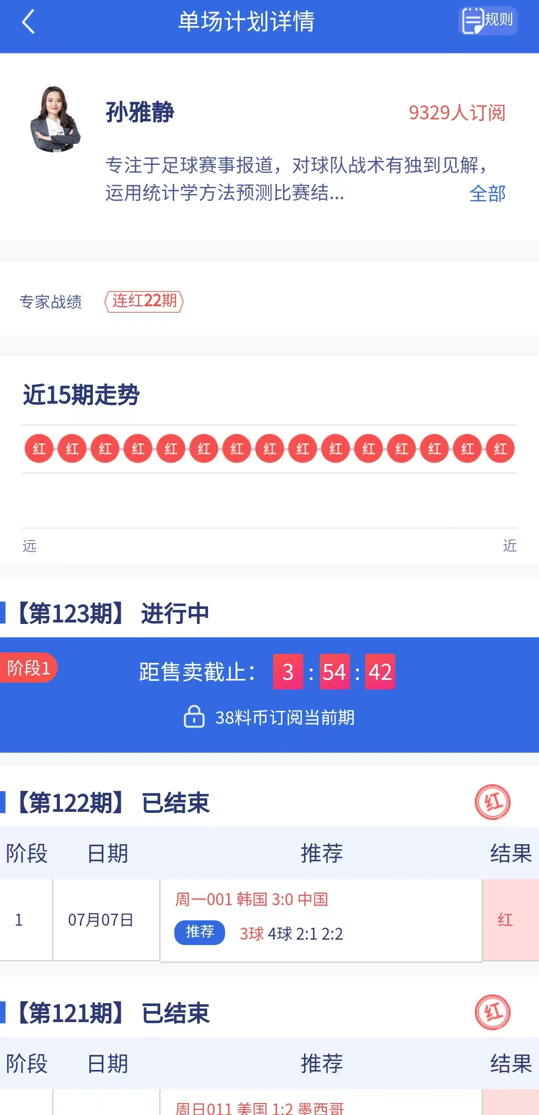 单场计划专家“孙雅静”目前连红22期,近3期均在第一阶段完成任务!今日最新计划已更新,不要错过!