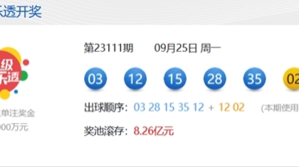 9月24日,超级大乐透第25110期开奖。前区开出号码01、15、22...